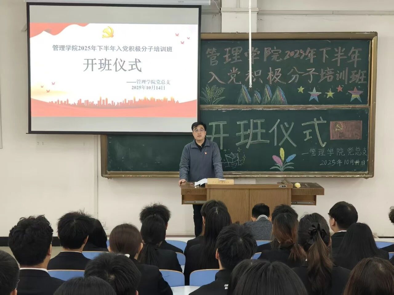 为更好的保证学校党员发展工作的质量,建设一支数量较多、素质较高、结构合理的入党积极分子队伍,为党组织输送优质后备力量,管理学院于2025年10月14日在业精楼C109举行2025年下半年入党积极分子培训班开班仪式。党总支书记鲍宇做开班动员并讲授专题党课、各学生党支部书记、全体入党积极分子参加,学生第二党支部书记孙斯慧主持。