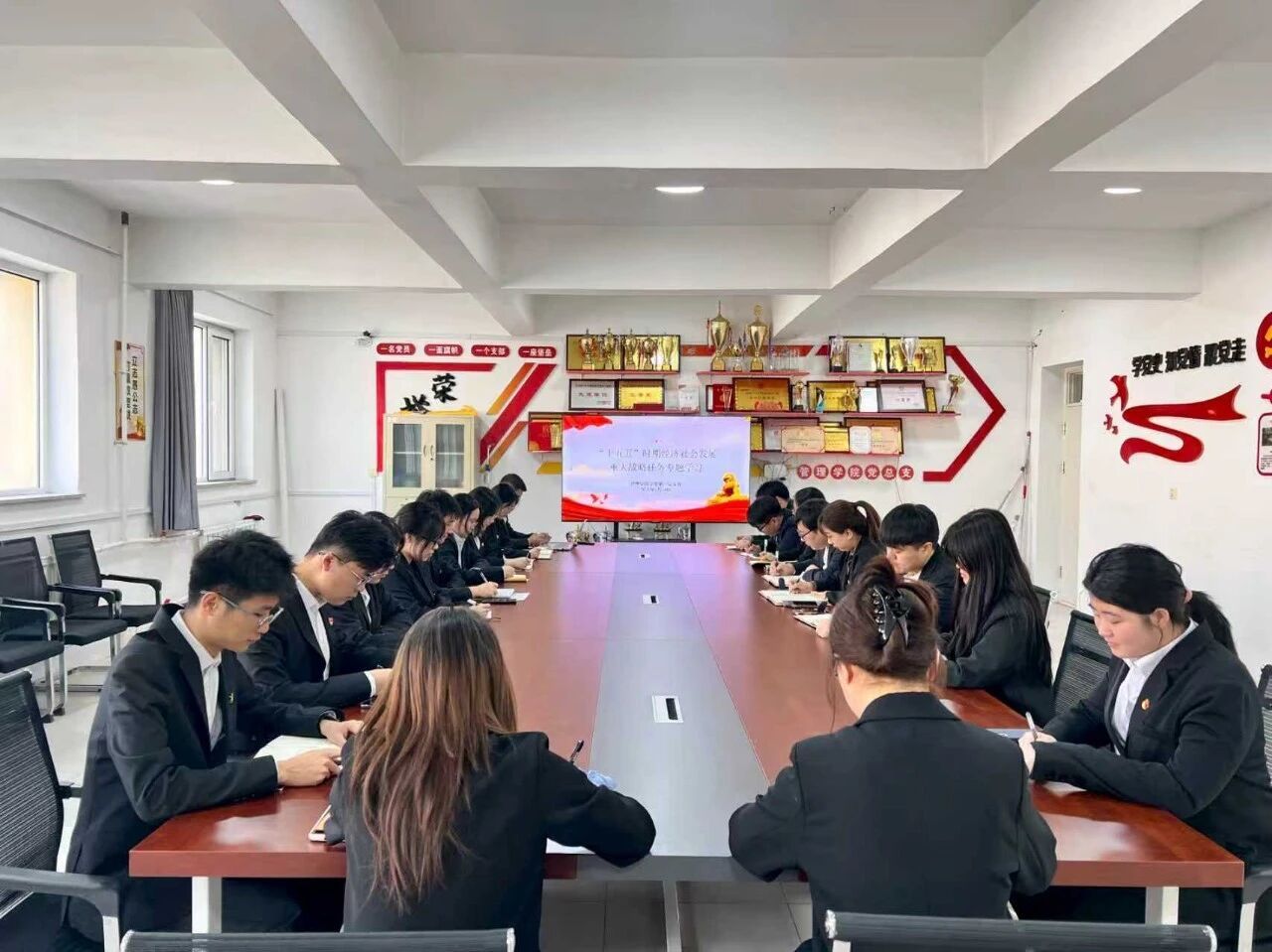 为深入学习贯彻党的二十届四中全会精神,切实把党员的思想和行动统一到党中央关于“十五五”时期发展的重大决策部署上来,深刻把握“十五五”时期经济社会发展重大战略任务的核心要义与实践要求,强化党员责任担当,凝聚发展奋进力量,近日,管理学院学生第一党支部在出新楼412会议室开展“‘十五五’时期经济社会发展的指导思想、重大原则和根本保证”和“‘十五五’时期经济社会发展的重大战略任务,支部全体党员参加学习。