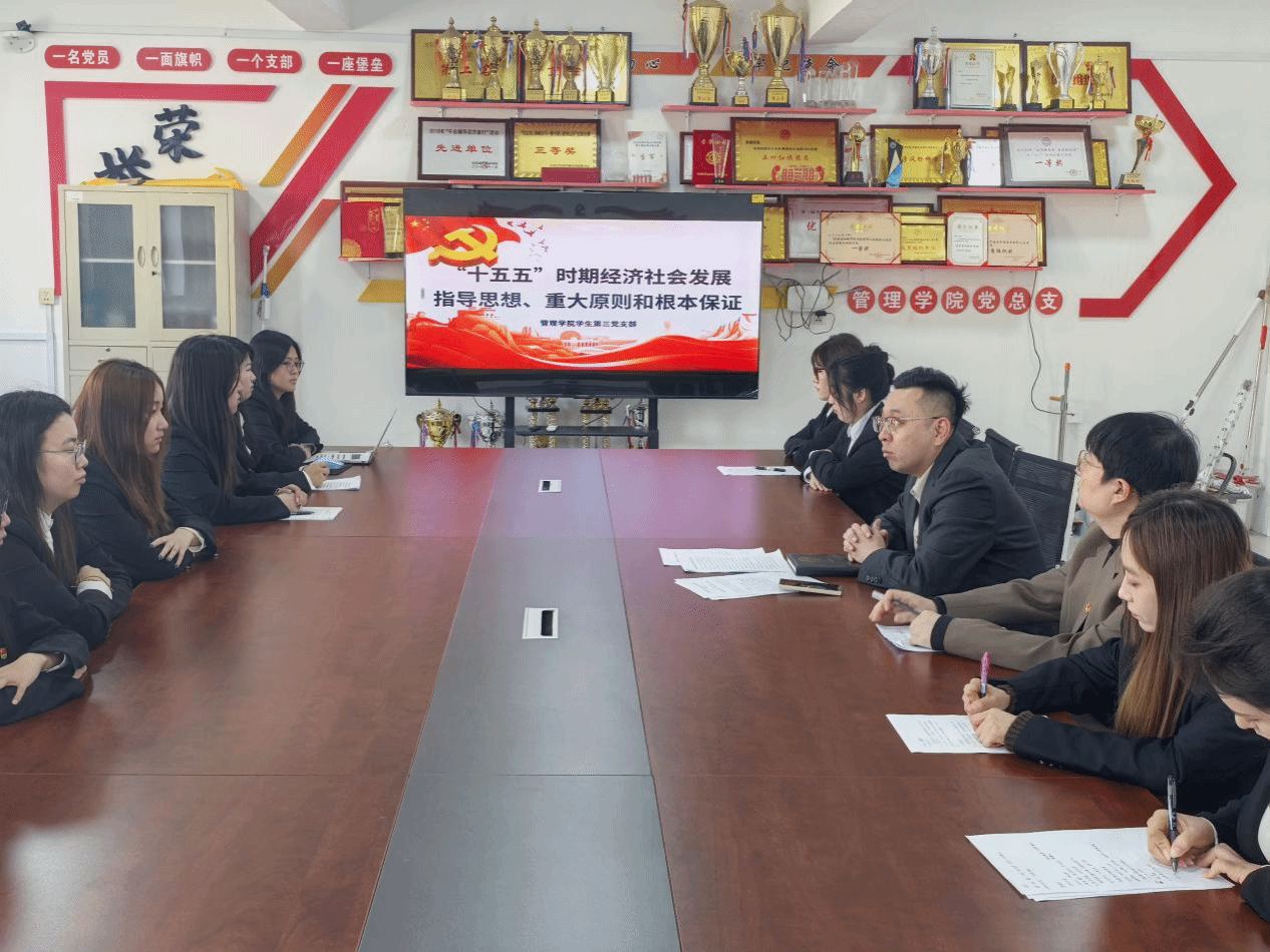 为深化对“十五五”时期经济社会发展指导思想、重大原则和战略任务的理解把握,推动学习成果向学业实践转化,近日期间,管理学院学生第三党支部在出新楼412组织召开集中学习会,主要围绕“十五五”时期经济社会发展的指导思想、重大原则、根本保证及重大战略任务深入学习交流。会议由党支部书记刘铮铮主持,全体师生党员参加学习。